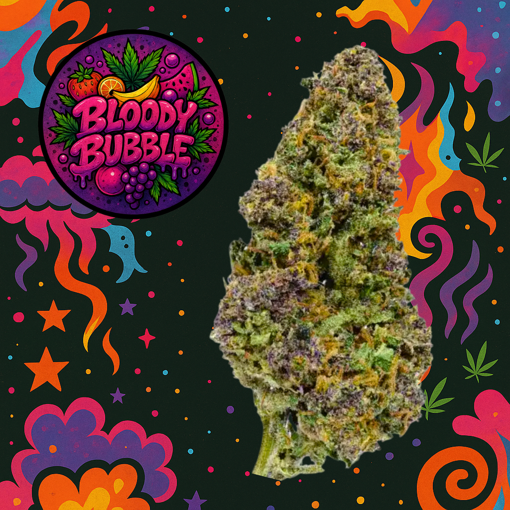 Bloody Bubble Infusionada es una flor de cáñamo premium infusionada con extracto natural de CBD para intensificar su aroma, sabor y potencia. Presenta cogollos compactos, bien curados y cubiertos de una capa de tricomas brillantes que le dan un aspecto resinoso y atractivo.